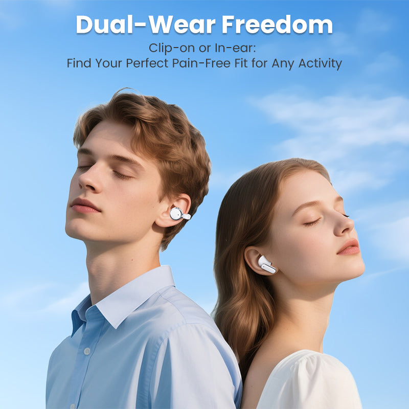 SŁUCHAWKI W PODWÓJNYM STYLU W JEDNYM ETUI: Ciesz się tym, co najlepsze z obu światów, dzięki konstrukcjom dousznym i z klipsem na ucho. Wybierz idealne dopasowanie do każdej aktywności, niezależnie od tego, czy potrzebujesz bezpiecznej izolacji podczas treningów, czy otwartego komfortu do codziennego słuchania.