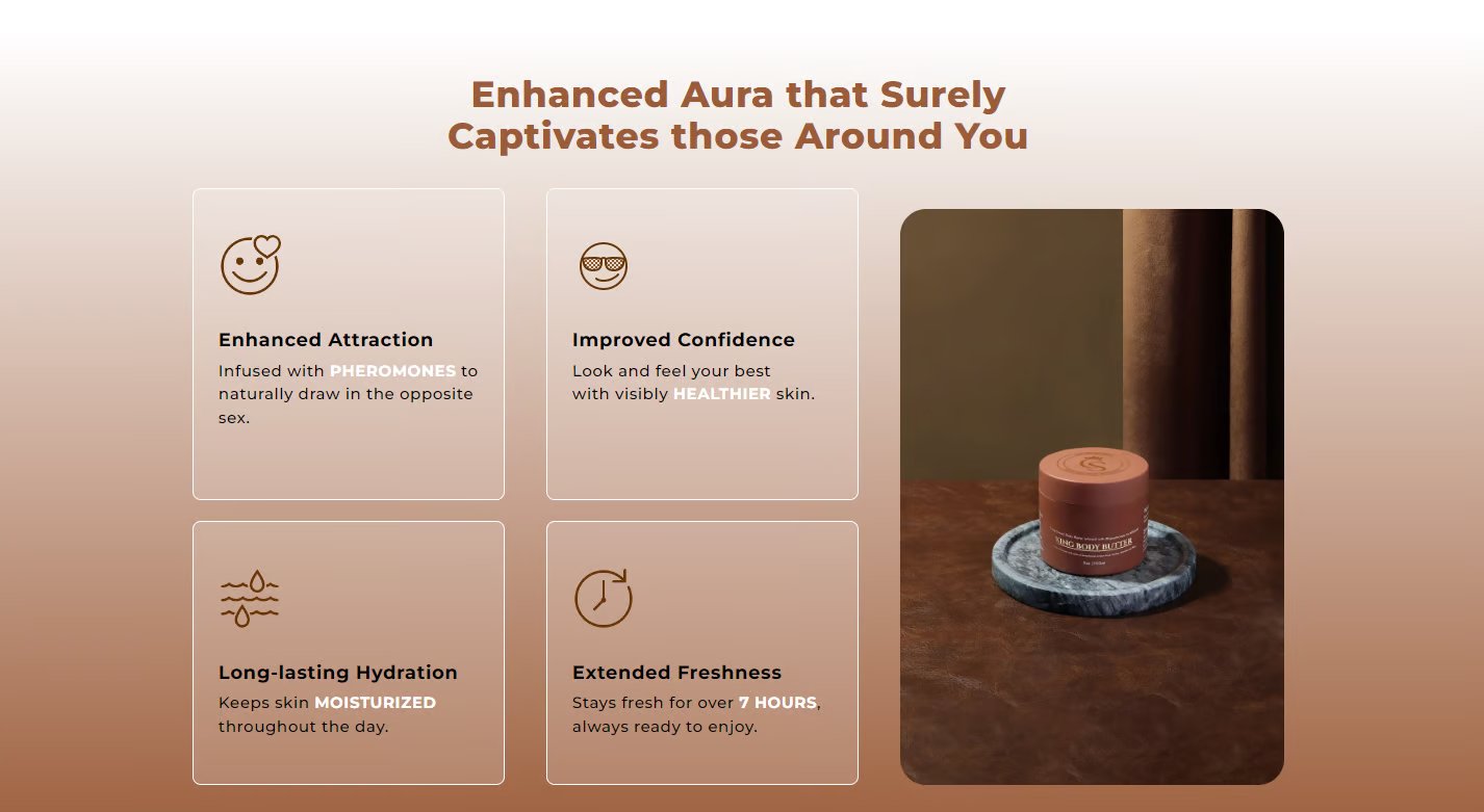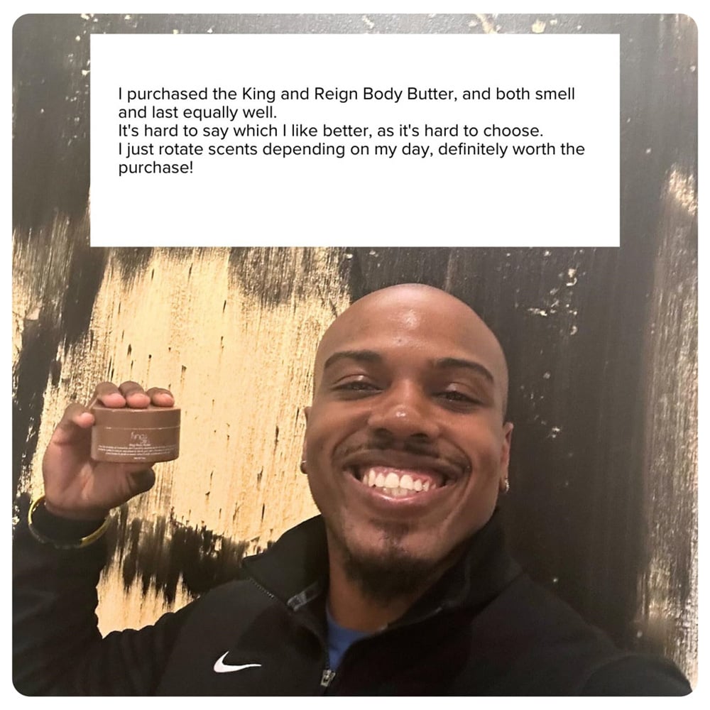 “What I love most is how it’s infused with shea and mango butter, so it really sinks in and leaves my skin feeling super soft and deeply hydrated all day. Plus, the scent is amazing — kind of luxurious and fresh — it totally elevates my vibe and boosts my confidence whenever I wear it. Definitely feels like a little royal treat for myself!”